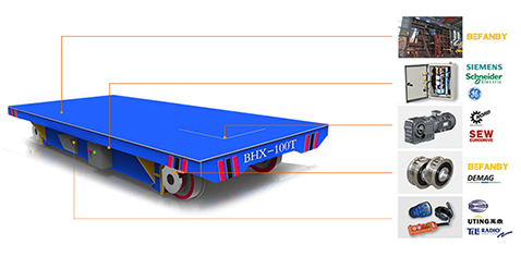 BHX:采用滑觸線將380V交流電源引入平車作為該平車的電力來源,其運行頻率和使用時間不受束縛,適用于較長距離運輸?shù)膱龊?。滑觸線安裝平車底部或兩側(cè),會對其他車輛的過往造成影響,但因其臺面較低,卻是流水線生產(chǎn)的 輸送設備。