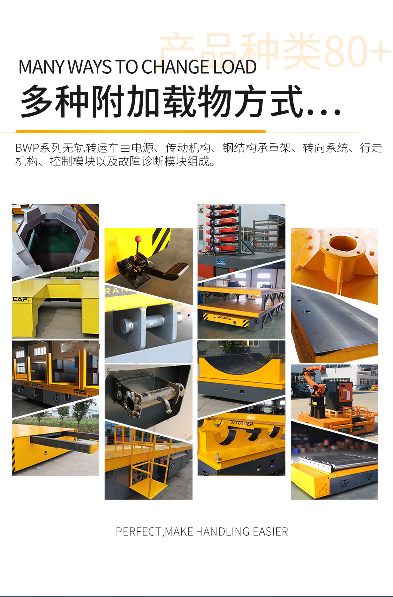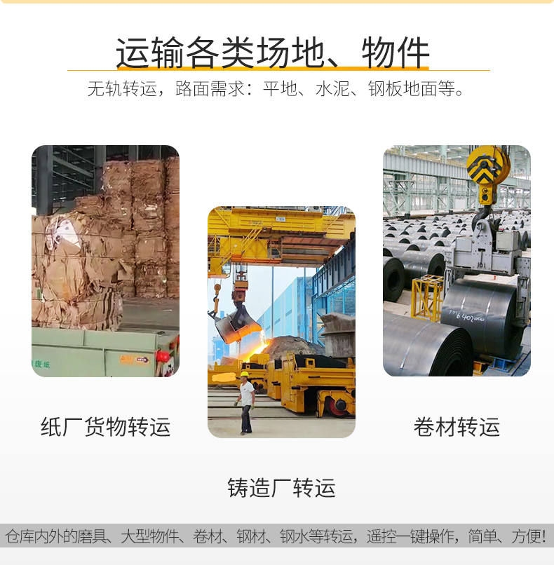 BZH型無(wú)軌搬運(yùn)車是一種以蓄電池或電纜為動(dòng)力源的車間內(nèi)運(yùn)輸車輛。又稱臺(tái)車、過(guò)跨車、地爬車。該車具有結(jié)構(gòu)緊湊、操作方便、可橫縱移動(dòng)、調(diào)速性能好及污染低、運(yùn)輸效率高等特點(diǎn)。該車型外形尺寸小,也可進(jìn)入空間小的倉(cāng)庫(kù)、彎道完成物料運(yùn)輸,可減輕工人的勞動(dòng)強(qiáng)度,提高生產(chǎn)效率。作為短距離運(yùn)輸工具得到廣泛應(yīng)用,也可作為車間內(nèi)部配合吊車運(yùn)輸重物過(guò)跨之用。 該車型采用是一種以蓄電池或電纜為動(dòng)力源,電壓可有24V、36V、48V、72V、110V。一般蓄電池安裝在平車內(nèi)部,電源通過(guò)電氣控制系統(tǒng),給電機(jī)提供電力,使平車實(shí)現(xiàn)啟動(dòng)、